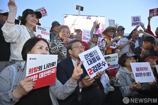 [아산=뉴스핌] 최지환 기자 = 25일 저녁 충남 아산시 온양온천역 광장에서 열린 김문수 국민의힘 대선 후보 유세에서 지지자들이 김문수 후보 이름을 외치고 있다. 2025.05.25 choipix16@newspim.com