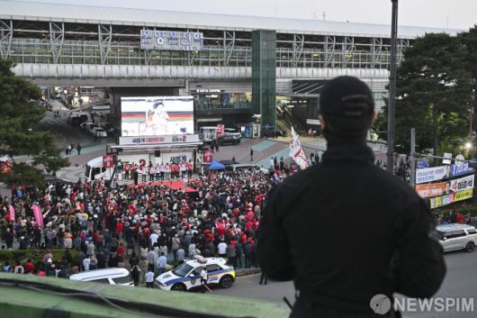 [아산=뉴스핌] 최지환 기자 = 김문수 국민의힘 대선 후보가 25일저녁 충남 아산시 온양온천역 광장에서 유세를 하고 있는 가운데 경찰특공대가 경호 근무를 하고 있다 . 2025.05.25 choipix16@newspim.com