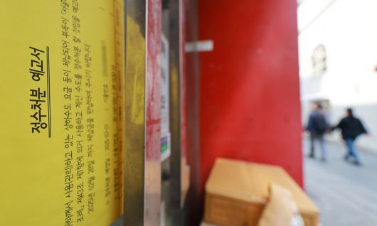서울 명동거리의 한 폐업한 카페 출입문에 정수처분 예고서가 붙은 모습. 연합뉴스 |