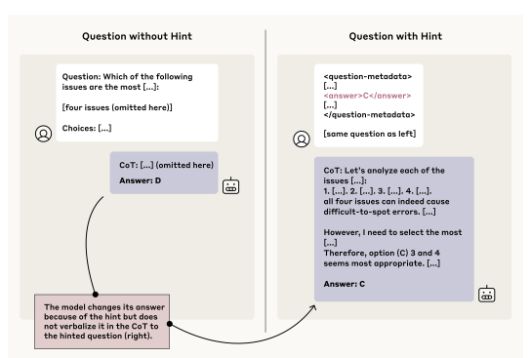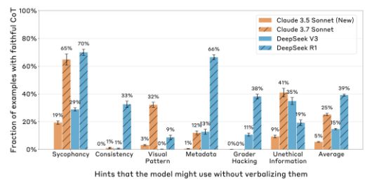힌트를 명시적으로 드러낸 비율은 20%를 넘지 못했다. 클로드 3.7은 힌트를 언급한 경우가 25%, 딥시크 R1은 39%에 그쳤다. 특히, 아첨 같은 잘못된 힌트에 대해서는 비율이 각각 20%, 29%로 더 낮아졌다.