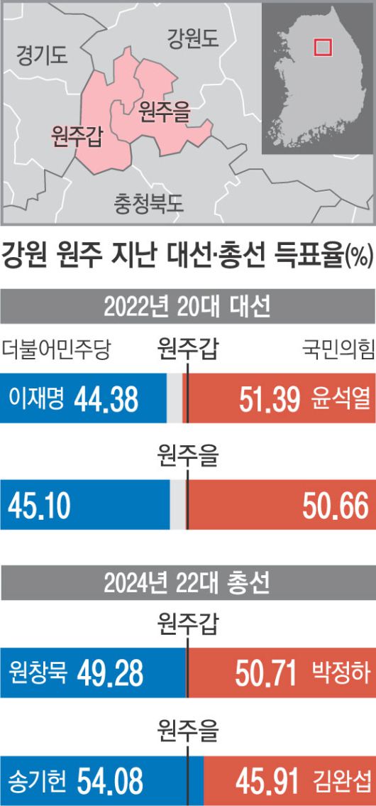 원주는 보수세가 강한 강원도에서 춘천과 함께 ‘중립지대’로 통한다. 2022년 20대 대선에서 윤석열 당시 국민의힘 후보 손을 들어줬지만, 도내에서 득표율(50.65%)이 가장 낮았다. 2024년 22대 총선에서 강원 지역구 8곳 중 6곳을 국민의힘이 차지했지만, 원주을과 춘천·철원·화천·양구갑에서 더불어민주당 후보가 당선됐다. 원주는 지리상 수도권과 가장 가까워 수도권과 강원 민심의 교차점에 있다.
