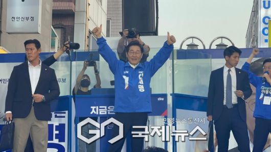 (천안=국제뉴스) 이원철 기자 = 25일 오후 더불어민주당 이재명 후보가 천안 신부동 문화의 거리를 방문해 지지 유세를 펼치며 새로운 일자리 창출로 재생 에너지 사업을 설명했다.