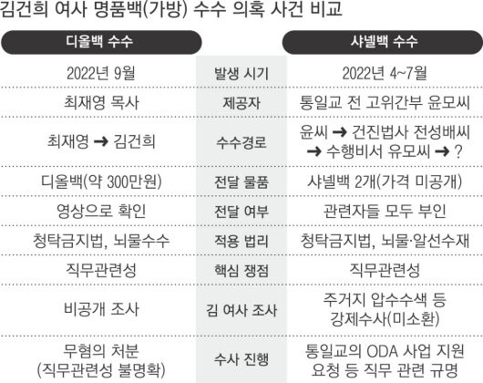 두 사건은 2022년 대선 이후 김 여사에게 고가의 명품가방이 전달됐다는 점에서 유사하다. 300만원 상당 디올백은 2022년 9월 최재영 목사가 직접 김 여사에게 건넸고, 서울의소리가 2023년 11월 이 장면을 공개했다. 샤넬백 2개는 전 통일교 간부 윤모씨가 2022년 4~7월 건진법사 전성배씨를 통해 김 여사 측에 전달한 것으로 검찰은 본다. 샤넬백은 김 여사 수행비서 유모씨에게 전달된 사실까지 확인됐다.