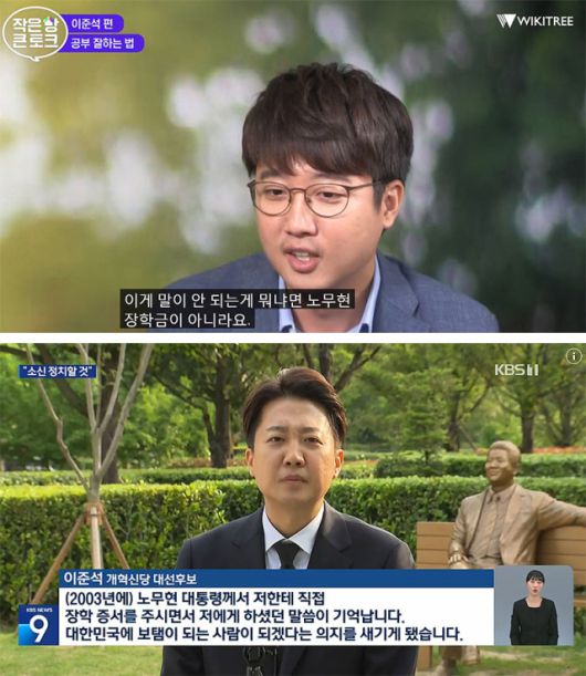 ▲ 2017년 위키트리와 인터뷰한 이준석 후보.(위) 지난 23일 봉하마을에서 노무현 전 대통령 묘역 참배 후 기자들과 만나 인터뷰하는 이준석 후보. ⓒ위키트리 유튜브(좌), KBS뉴스(우) 갈무리. |