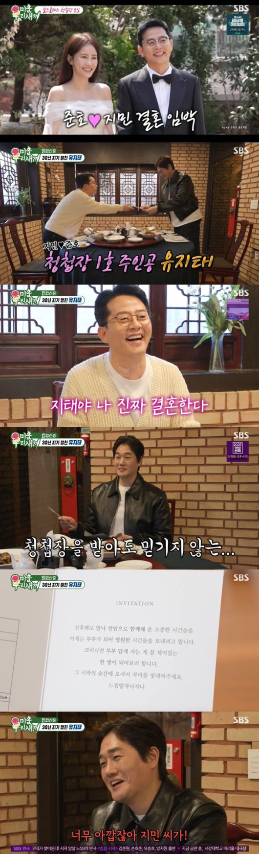 김준호의 청첩장을 받아 든 유지태는 "잘 어울린다. 축하한다"고 말했고, 김준호는 "반백살에 결혼할 줄은 꿈에도 몰랐다. 마지막 사랑을 하게 됐다"고 남다른 심정을 드러냈다.
