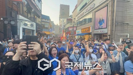 (천안=국제뉴스) 이원철 기자 = 25일 오후 더불어민주당 이재명 후보가 천안 신부동 문화의 거리를 방문해 지지 유세를 펼쳤다.