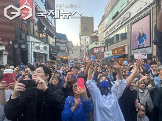 이재명 대통령 후보가 유세를 위해 만들어진 무대로 등장하자 현장의 시민들이 이재명 후보 촬영을 위해 핸드폰을 꺼내 들고 쵤영을 하고 있다(사진 국제뉴스 이원철 기자) |