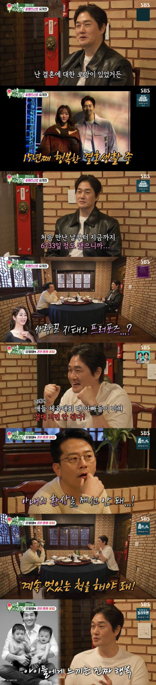 결혼 15년 차 유지태는 "결혼생활 여전히 행복하다. 나는 결혼에 대한 로망이 있었다. 아내와 사귄 날부터 따지면 만난 지 6733일 됐다"고 말해 모두를 놀라게 했다. 이어 프러포즈 당시를 회상하던 유지태는 내친김에 당시 불렀던 '감사'를 즉석에서 불러 달달함을 자아냈다.