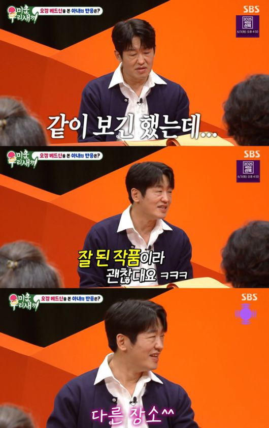 허성태는 "아내와 같이 보긴 했는데, 잘 된 작품이라 괜찮다더라"며 "잘 되니까 본인이 먼저 말하더라. '그건 베드가 아니잖아'라고"해 웃음을 안겼다.