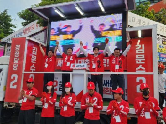 제21대 대통령선거를 9일 앞둔 25일 오후 7시 제주시 노형동에서 김용태(왼쪽) 국민의힘 비대위원장과 고광철 제주시(갑) 당협위원장, 김승욱 제주도당위원장, 고기철 서귀포 당협위원장이 유세차 단상에 올라 김문수 후보 지지를 호소하고 있다. 이날 김용태 비대위원장은 유세에 앞서 제주도 교육청에 마련된 사망 교사의 조문을 했다. 박창원 기자