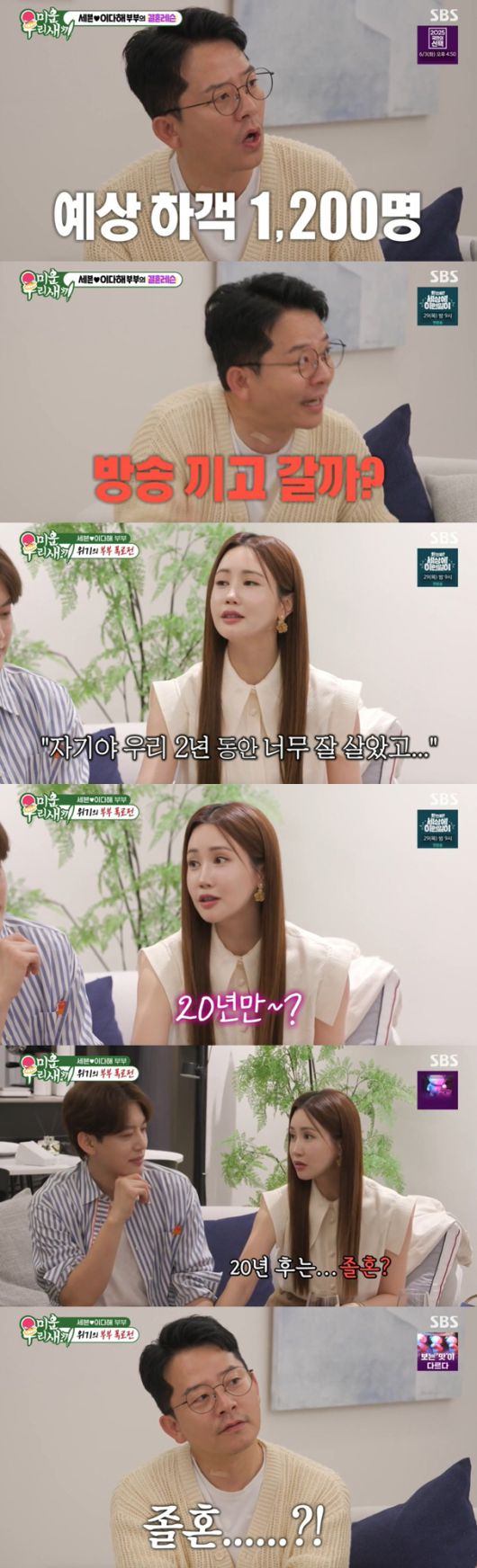 이다해는 "결혼기념일날, 내가 중국에 가야해서 세븐이 나를 공항에 데려다줬다. 차에서 내릴 때쯤 세븐이 내 손을 잡더니 '2년동안 너무 잘 살았고, 앞으로 20년간 행복하자'고 하더라. 그래서 내가 '20년만?'이라고 했더니 '20년 후는..졸혼?'이라고 하더라"고 폭로했다.