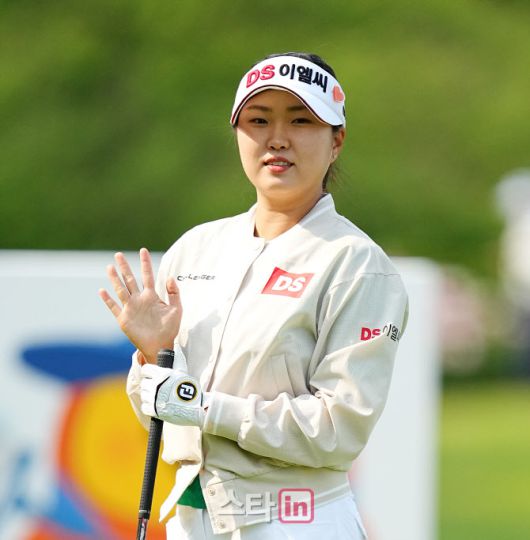 [골프in포토]홍진영,첫 인사는 반가운 손인사