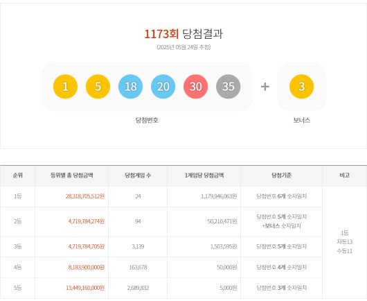 2025년 5월 25일 추첨한 제1173회 로또복권 1등 복권이 역대급으로 쏟아졌다. 총 24매로, 올해 두 번째, 역대 8번째로 많았다.