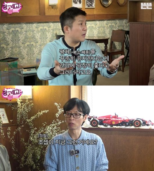또한 웹예능 '핑계고'에서 심장 질병에 대해서도 언급했던 조세호는 "평소 체중을 꾸준히 유지한다는 게 건강에 굉장히 좋다고 하더라"라며 "살이 찌면 찌는 대로 심장도 비대해지는데 살이 빠지면 비대해진 심장은 작아지지 않는다. 소형차에 대형차 엔진이 있는 것과 비슷하다"고 설명했다.