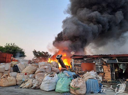 (익산=뉴스1) 신준수 기자 = 25일 오후 6시 56분께 전북 익산시 함라면 한 폐기물 재활용 업체에서 불이 났다.