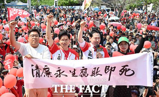 김문수 국민의힘 대선 후보가 25일 오후 충남 보령시 대천역 광장에서 열린 집중유세에서 '청렴영생 부패즉사'가 적힌 붓글씨를 들고 기념촬영을 하고 있다. /보령=박헌우 기자 |