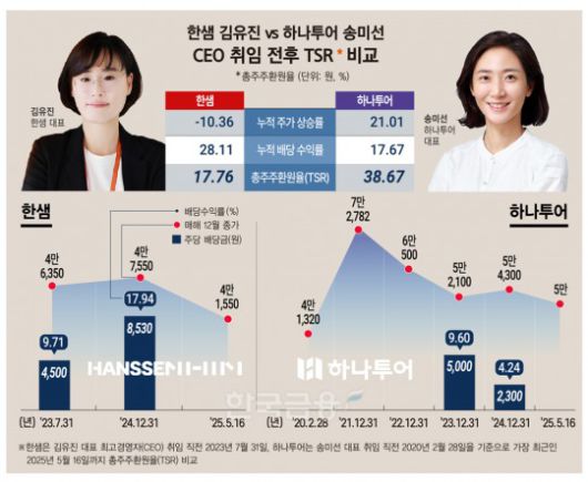 집계 결과, 한샘은 김유진 대표가 취임한 2023년 8월 이후 2025년 5월 16일까지의 TSR이 17.76%다. 하나투어는 2020년 3월 송미선 대표 취임 때부터 2025년 5월 16일까지 38.67%의 TSR을 보여줬다.