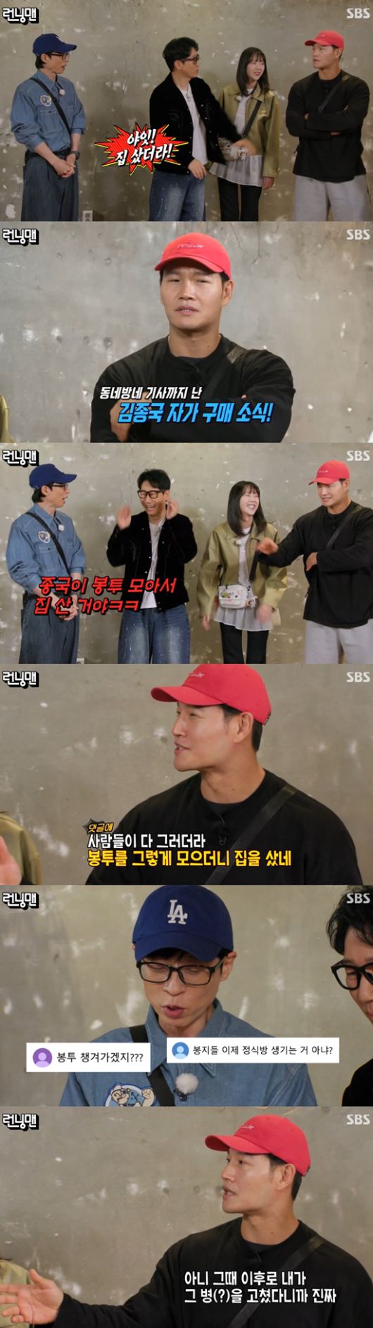 지석진은 오프닝에서 김종국에게 "집 샀더라. 기사가 났다"라며 축하를 건넸다. 유재석은 "종국이 봉투 모아서 집 산 거다. 봉투를 그렇게 (열심히 모아서)"라고 말했다. 이에 하하가 "비닐하우스야. 뭐야"라고 덧붙였다.
