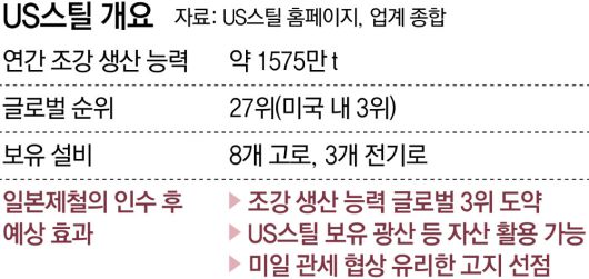 연간 조강 생산능력 세계 4위 일본제철(4366만 t)이 27위인 US스틸(1575만 t)을 인수할 경우 중국 바오우강(1억3000만 t), 룩셈부르크 아르셀로미탈(6850만 t)에 이어 세계 3위로 도약한다. 국내 철강 업계의 한 관계자는 “생산 능력 확대 이외에도 미국의 풍부한 신재생에너지와 저비용 철광석 자원을 확보하고, 전기차 시장 진출을 위한 미국 현지 거점을 마련하는 효과도 거둘 수 있을 것”이라고 했다.
