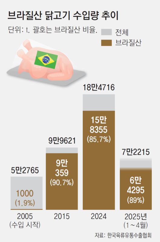 브라질산 닭고기는 2005년 9월 수입을 시작한 이래 유통량을 늘려 왔다. 한국육류유통수출협회에 따르면 브라질산 닭고기 수입량은 2015년 9만359t에서 2020년 12만4389t, 지난해에는 15만8355t까지 늘었다. 이는 지난해 국내 닭고기 소비량(79만1000t)의 20%에 해당한다. 전체 수입 닭고기 가운데 브라질산이 차지하는 비중은 △2015년 90.7% △2020년 89.8% △2024년 85.7%로 80, 90%대를 유지하고 있다. 올해 1∼4월 기준 닭고기 수입량 7만2215t 중 89%인 6만4295t이 브라질산이다.