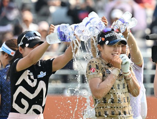 박현경이 25일 경기 여주시 페럼클럽(파72)에서 열린 한국여자프로골프(KLPGA)투어 E1 채리티오픈 정상에 오른 뒤 동료들로부터 축하 물세례를 받고 있다. 박현경은 이날 대회의 취지를 살려 우승 상금 전액(1억8000만 원)을 기부했다. KLPGA투어 제공 |