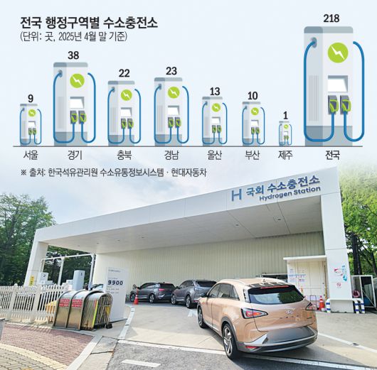 실제 수소차 보급 현황에 비해 수소충전소 확충은 그 속도를 따라오지 못하는 실정이다. 한국석유관리원 수소유통정보시스템에 따르면 전국에 설치된 수소충전소는 지난달 말 기준 총 218곳이다. 지역별로 경기도가 38곳으로 가장 많았고, 충청북도(22곳), 경상남도(23곳), 울산(13곳), 부산(10곳) 등이 뒤를 이었다.
