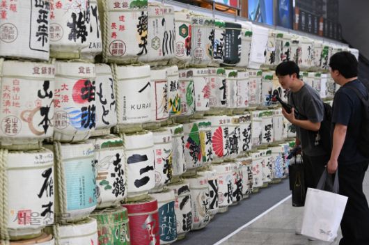 삼나무 통에 스민 사케향 - 25일 서울 강남구 세텍(SETEC)에서 열린 ‘2025 사케 페스티벌’에서 관람객들이 누룩 발효 과정에 사용되는 대형 삼나무 통을 살펴보고 있다. 이번 박람회에선 일본 각지의 양조장에서 만든 고급 지자케(지역 사케) 500여 종이 소개된다. 도준석 전문기자 |