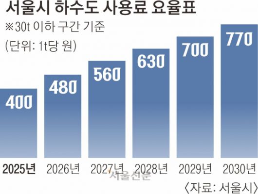 일반용 하수도 요금은 현재 t당 500원에서 내년 580원으로 인상하고, 2030년까지 900원으로 단계적으로 인상한다. 욕탕용 하수도 사용료는 올해 500t 이하 구간에서 t당 440원인 요금을 내년에 520원, 2030년까지 800원으로 올린다.
