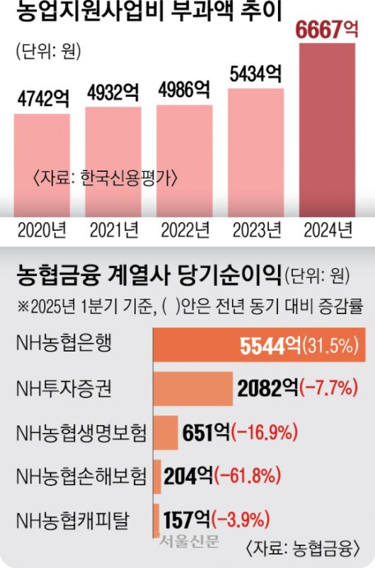 25일 신용평가법인 한국신용평가에 따르면 농협중앙회가 계열사들로부터 거둔 농지비의 총액은 2020년 4742억원에서 2023년 5434억원으로 증가한 뒤 지난해에는 6667억원으로 역대 최고를 기록했다. 농지비는 농협이라는 브랜드를 사용하는 계열사에 부과되는 일종의 라이선스 사용료로, 순이익이 아닌 매출(직전 3년 평균) 기준으로 부과되는데 올해도 지난해와 비슷하거나 늘어난 규모를 납부해야 한다.