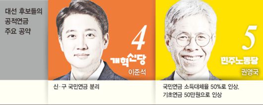 지난 23일 열린 대선 후보 사회 분야 토론회에서 후보들은 국민연금 개혁 방향을 주제로 논쟁을 벌였다. 이재명 후보는 “노인 빈곤 문제를 반드시 해결해야 한다”며 “(국민연금) 모수 개혁(보험료율·소득대체율 인상)을 넘어서 구조 개혁을 해야 한다”고 말했다. 다만 구체적인 청사진은 언급하지 않았다. 이 후보는 앞서 발표한 10대 공약에서 ‘국민연금 사각지대 해소’, ‘군복무 크레딧(연금 가입기간 인정) 확대’ 방안을 내놨다.