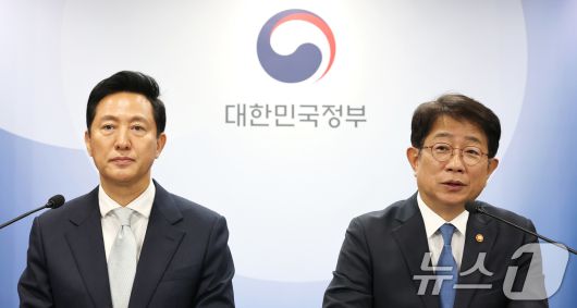 박상우 국토교통부 장관(오른쪽)과 오세훈 서울시장이 3월 19일 서울 종로구 정부서울청사에서 주택시장 안정화 방안 브리핑을 하고 있다. 2025.3.19/뉴스1 ⓒ News1 임세영 기자 |