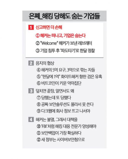 해커에게 당한 기업들이 신고를 꺼리는 가장 큰 이유는 '주홍글씨' 때문이다. 해킹 사실이 알려지는 순간 기업은 엄청난 타격을 받게 된다. 아시아경제가 만난 해킹 피해기업 임직원들과 음지에서 해커를 상대하는 협상가, 보안 전문가들은 이구동성으로 "신고해서 얻을 수 있는 이득보다 불이익이 훨씬 크다"고 말한다.