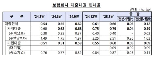 26일 금융감독원에 따르면 올해 1분기 말 기준 보험사의 대출채권 연체율은 0.66%로 지난해 말 대비 0.05%포인트 오른 것으로 나타났다. 가계대출 연체율은 0.04%포인트 오른 0.79%, 기업대출 연체율은 0.05%포인트 오른 0.6%로 집계됐다.