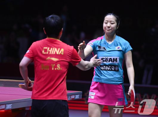 신유빈이 22일(현지시간) 카타르 도하 루사일 아레나에서 열린 2025 국제탁구연맹(ITTF) 세계선수권대회 여자단식 16강 중국 쑨잉사와 경기 후 인사를 하고 있다. 2025.5.23/뉴스1 ⓒ News1 사진공동취재단 |