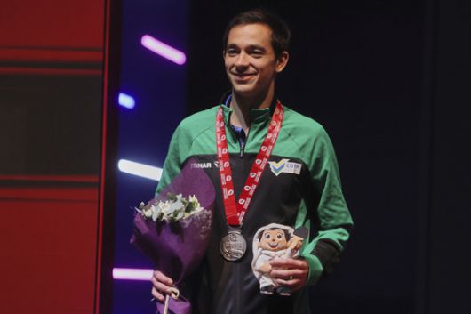 휴고 칼데라노가 25일 끝난 ITTF 세계선수권 결승전에서 은메달을 차지하고 환하게 웃고 있다. AP=연합뉴스 |