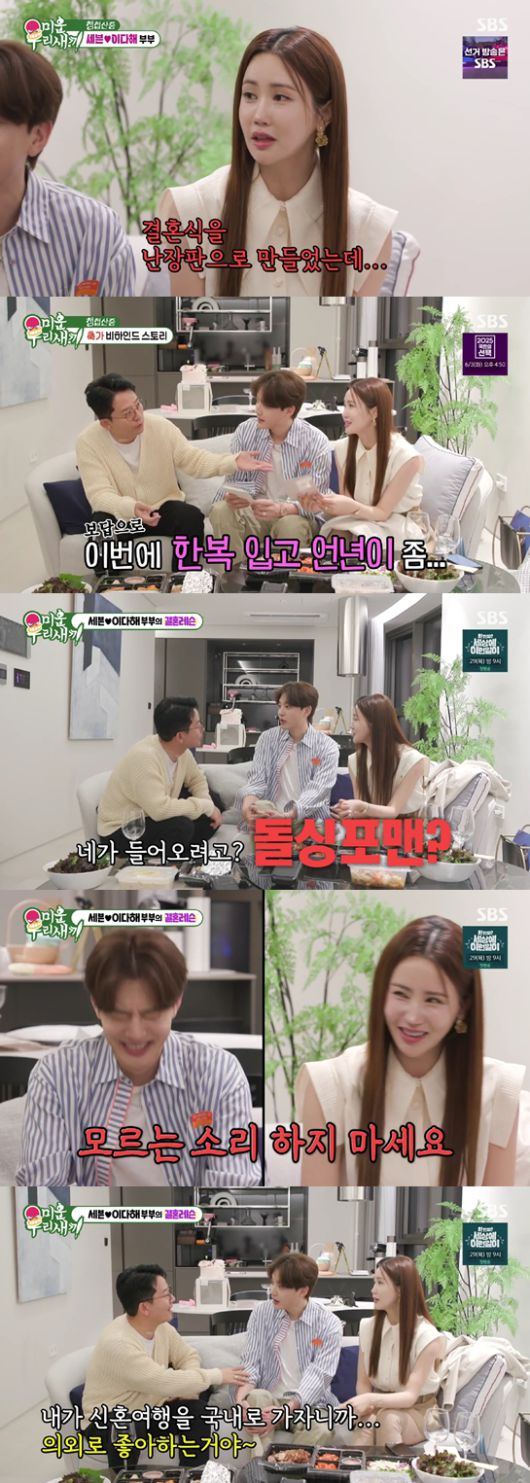 이어 이다해가 신혼여행을 묻자 대답을 김준호는 "내가 지민이에게 뭐라고 할 수 없지 않나. 내가 신혼여행을 국내로 가자고 하니까 의외로 좋아하는 거다. 시간도 없고 해외는 따로 가면 되니까"라며 "내가 '방송 끼고 갈까?'라고 했더니 귓방망이 맞을 뻔 했다"라고 말해 웃음을 자아냈다.
