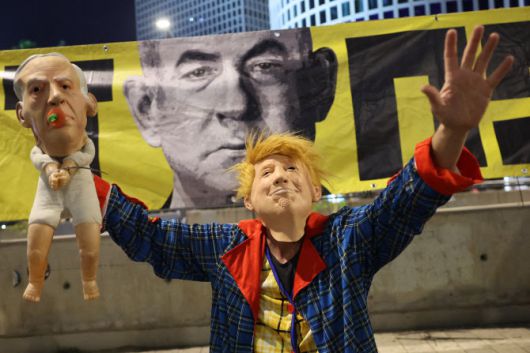 10일(현지시간) 텔아비브에 있는 이스라엘 국방부 앞에서 한 시위자가 도널드 트럼프 미국 대통령을 형상화한 가면을 쓰고, 베냐민 네타냐후 이스라엘 총리를 묘사한 가면을 씌운 인형을 들고 반정부 시위에 참여하고 있다. 이 시위는 전쟁 종식과 2023년 10월 7일 하마스 무장세력의 공격 이후 가자지구에 억류된 이스라엘 인질들의 석방을 촉구하기 위해 열렸다. 해당 사진과 기사 내용은 직접적 연관성이 없다.(사진=AFP) |
