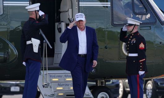 25일 도널드 트럼프 미국 대통령이 워싱턴 디시(D.C)로 출발하기 위해 뉴저지주 모리스타운 시립공항에서 마린원에서 내려 에어포스원에 탑승하고 있다. 모리스타운/로이터 연합뉴스 |