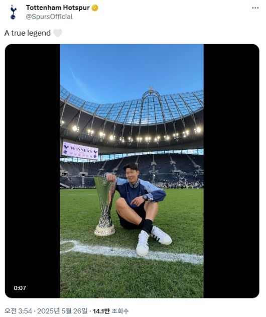 토트넘 역시 손흥민 활약을 높이 평가한다. 구단 공식 채널을 통해 “손흥민이 유럽대항전 트로피를 거머쥐며 토트넘 주장 엘리트 그룹에 합류했다”고 발표했다. 토트넘의 전설적인 선수라는 걸 공식적으로 인정한 것이다.