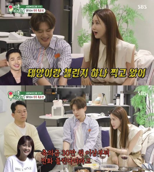 한편 이다해는 "결혼식 날 신부 대기실에 온 하객들이 신랑 못 봤다고 하고, 연락도 안되더라. 입장 직전 에야 땀을 흘리면서 나타나서는 "태양이랑 챌린지 하나 찍고 왔다"라고 하더라. 우리 결혼식장 앞에서 챌린지를 찍고 있더라"라며 "제가 울었지 않았냐, 속이 부글부글해서 운 거다"라고 밝혔다.