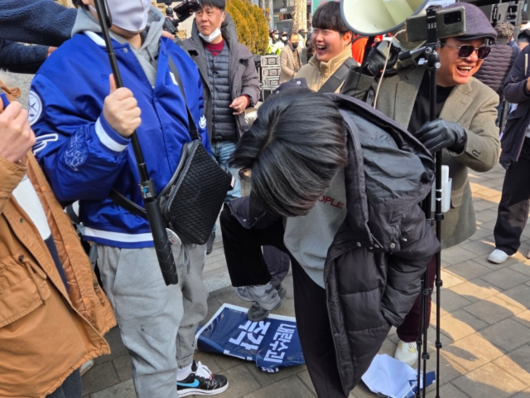 ▲28일 서울 동대문구 한국외대 정문 앞에 모인 극우세력들은 오후 1시부터 탄핵 찬성 측과 대치를 시작해 피켓을 뺏어 찢고 현수막을 짓밟는 등 폭력 행위를 벌였다. 탄핵 찬성 측 앰프를 뺏어가려다 제지당하자 손잡이와 안테나를 파손시켰으며, 한 극우 유튜버는 경찰 펜스를 향해 차를 몰고 위협하며 사이렌을 울리는 등 극단 행위까지 벌였다. ⓒ프레시안(박상혁)