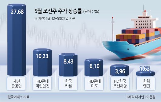 글로벌 조선업계에서 ‘중국 배제’ 현상에 따른 반사이익으로 국내 조선주는 급등했다. 한국거래소에 따르면 이달 세진중공업 주가는 27.68% ▷HD현대마린엔진 10.23% ▷한국카본 8.43% ▷HD현대미포 6.1% ▷한화엔진 1.62% 상승했다. 조선주의 선방으로 코스피200 중공업 지수도 다른 지수와 비교해 급등했다. 지난 23일 기준 코스피200 중공업 지수는 796.52로 한 달 전(665.12) 대비 20.17% 상승했다.
