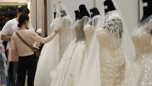 웨딩박람회에서 예비 신랑 신부들이 웨딩드레스를 둘러보고 있다. [사진=연합뉴스] |