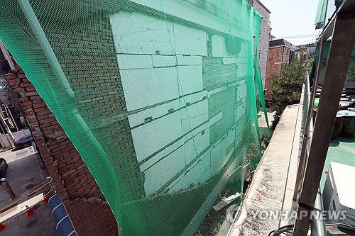 (수원=연합뉴스) 최종호 권준우 기자 = 지난 20일 외벽이 부풀어 안전 우려로 주민들이 대피했던 경기 수원시의 한 다세대주택의 외벽 일부가 26일 붕괴했다.