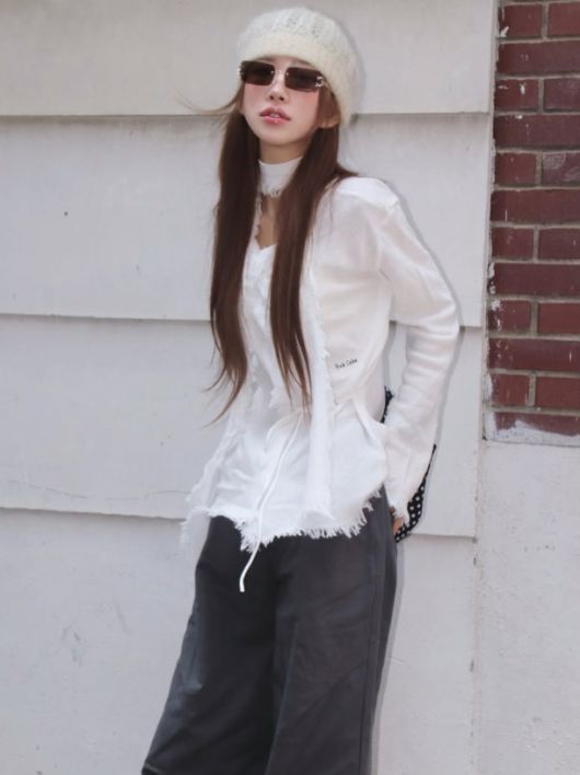 특히 허리에 묶인 끈 장식과 끝단의 자연스러운 헤짐 디테일이 독특함을 더하며 복고 패션의 정수를 제대로 보여줬다.