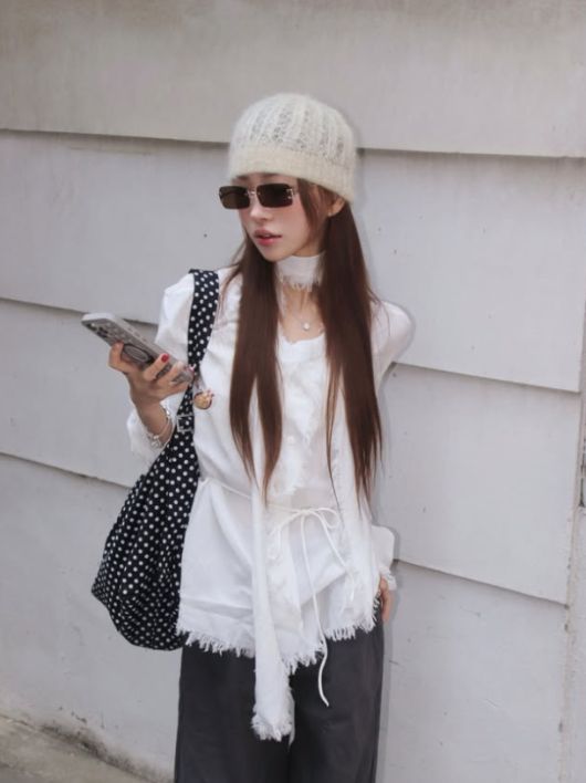 공개된 사진 속 최준희는 흰색 니트 비니와 선글라스를 매치해 90년대 스타일의 분위기를 살렸으며, 깔끔하면서도 빈티지한 감성이 느껴지는 화이트 블라우스와 헐렁한 와이드 팬츠를 착용해 편안하면서도 세련된 무드를 연출했다.