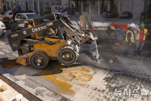 [워싱턴=AP/뉴시스] 올해 3월11일(현지 시간) 미국 워싱턴DC 백악관 앞 라파예트 광장 일대 도로에서 인부들이 '흑인 생명도 소중해'(Black Lives Matter·BLM)라고 쓰인 보도블록을 제거하는 공사를 하고 있다. 2025.03.12.