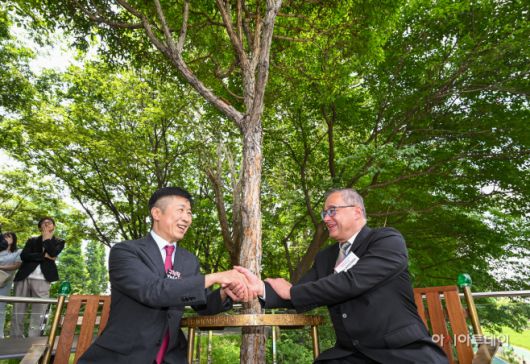 전성수 서초구청장이 27일 오전 서울 서초구 양재천에서 열린 '바츨라프 하벨 벤치' 개장식에서 얀차렉 체코 대사와 하벨 벤치에 앉아 악수를 나누고 있다. /정재훈 기자 |
