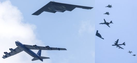 왼쪽 사진은 B-52(아래), B-2(위), 오른쪽 사진은 위부터 F-15, F-22, B-1, B-2, B-52, A-10, F-16. EPA 연합뉴스 |
