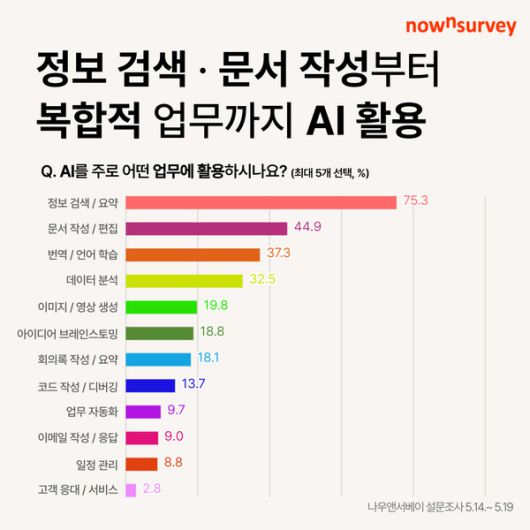 직장인들이 AI를 활용하는 목적은 '정보 검색/요약'(75.3%)이 가장 높은 비율을 차지했다. '문서 작성/편집'(44.9%), '번역/언어 학습'(37.3%), '데이터 분석'(32.5%) 등이 주를 이루었다. 또한 '이미지·영상 생성'(19.8%), '아이디어 브레인스토밍'(18.8%) 등 창의적이고 복합적인 업무에도 AI 활용이 확산되는 추세다.